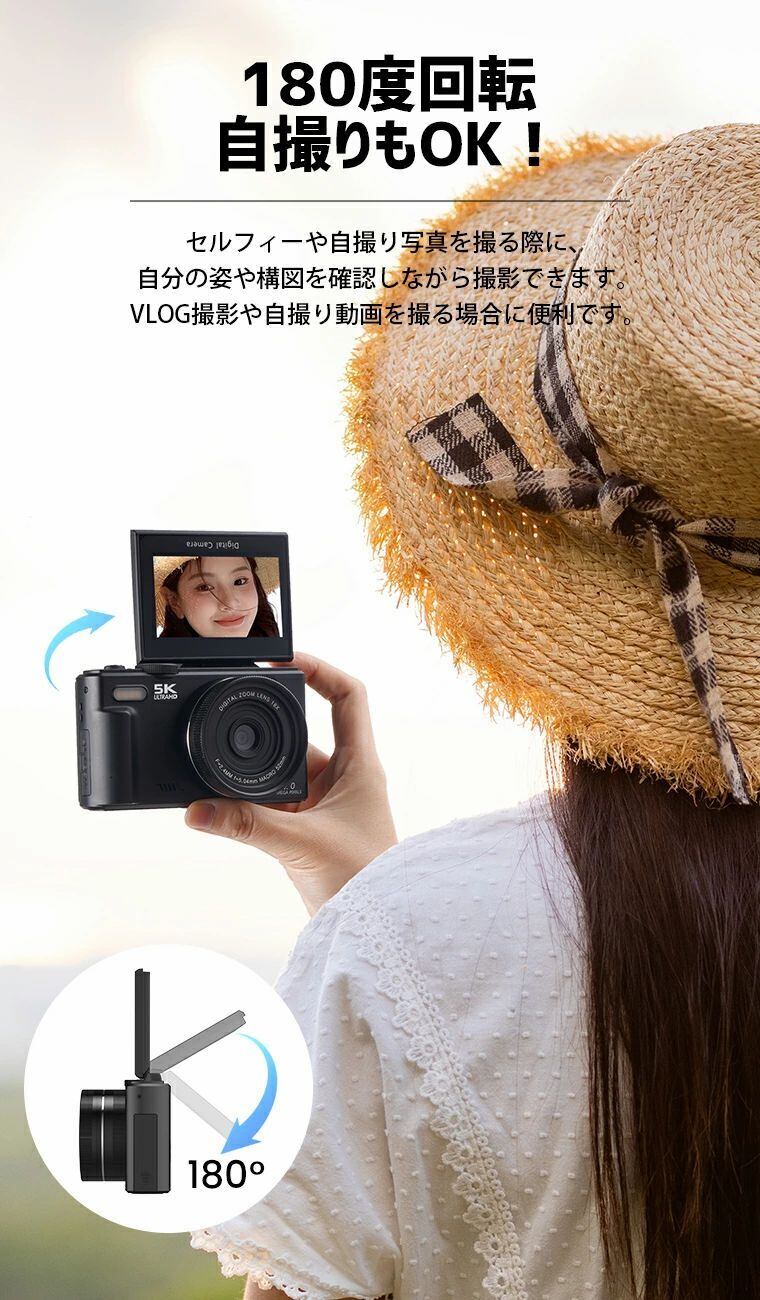 64GBカード無料贈呈 5Kデジタルカメラ コンパクト撮影カメラ 180°回転自撮り 7500/6400万画素 5K録画 3.0インチ画面 18倍ズーム USB充電 タイマー撮影 Wifi機能 内蔵ライト vlog/YouTube/Webカメラ 日本語説明書 卒業 修学 旅行